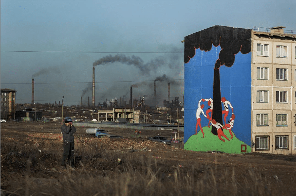 In 2016, Cas tackled these issues with his mural “Dancing!”, featured above, painted on an apartment building in Temirtau — a residential area with industrial plants. He juxtaposed Henri Matisse’s “Dance,” which originally stood for luminosity, joy and rebirth, around a smokestack.